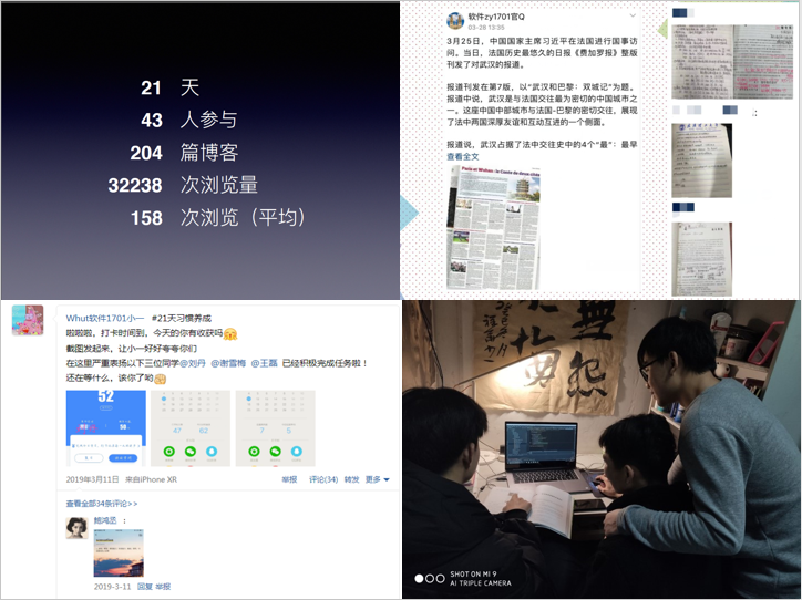 在行为心理学中,人们把一个人的新习惯或理念的形成并得以巩固至少需要21天的现象,称之为21天效应。各班以21天为周期,号召同学们共同坚持一件小事,部分班级采取了英语学习和步道乐跑这两种同学们平时都会接触的形式,创建小组由专人根据打卡比例即时提醒,以便让大家从容应对四六级考试和体质健康测试。针对部分课堂“抬头率”不高的问题,软件1701和软件zy1701采用“笔记打卡”的形式,同学们在班级QQ账号每天的推送下打卡,形成了记录、分享和监督的氛围。